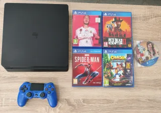 Consola PlayStation 4 Slim de 1TB en color negro, junto con cinco videojuegos. - Incluye mando DualShock 4 azul. - Juegos: Marvel's Spider-Man, FIFA 20, Crash Bandicoot N. Sane Trilogy, Red Dead Redemption 2 y GTAV (sin caratula). Todos sus componentes son originales.
