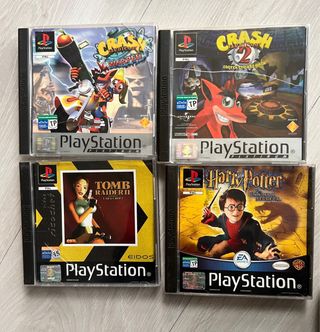 Conjunto de cuatro videojuegos clásicos para PlayStation 1 (PS1). Los juegos están en español. - Crash Bandicoot 3: Warped. Completo - Crash Bandicoot 2: Cortex Strikes Back. Completo - Tomb Raider II. Completo - Harry Potter y la Cámara Secreta. Falta manual