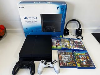 Consola PlayStation 4 de 1TB en color negro, edición Ultimate Player. - Incluye dos mandos (uno negro y uno blanco). - Incluye los siguientes juegos: FIFA 16, FIFA 17, FIFA 21, Grand Theft Auto V y Crash Bandicoot. - Incluye auriculares.