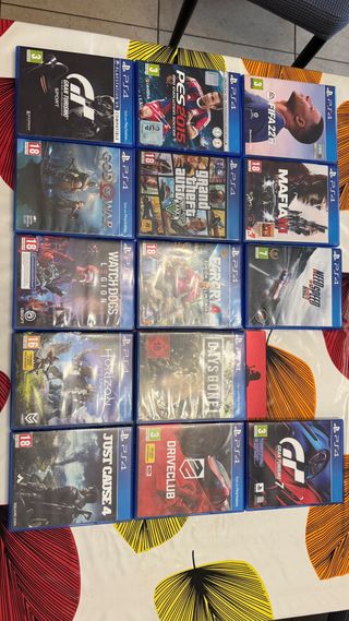 Pack de videojuegos para PlayStation 4. - Gran Turismo Sport - PES 2015 - FIFA 22 - God of War - Grand Theft Auto V - Mafia III - Watch Dogs Legion - Far Cry 4 - Need for Speed - Horizon Zero Dawn - Days Gone - Just Cause 4 - Driveclub - Gran Turismo 7