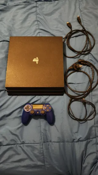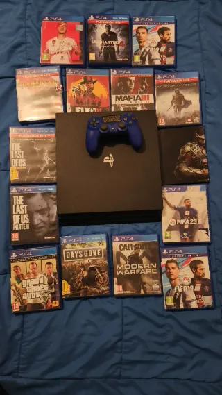 Consola PlayStation 4 Pro de 1TB con mando en buen estado y 2 mandos con detalles. Incluye 14 videojuegos: - 2 FIFA 19 - FIFA 20 - FIFA 23 - Grand Theft Auto V - Red Dead Redemption 2 - Uncharted 4 - The Last of Us - The Last of Us Parte II - Days Gone - Call of Duty: Modern Warfare - Mafia III - God of War III remastered - Shadow of Mordor - Sombras de guerra caja metálica