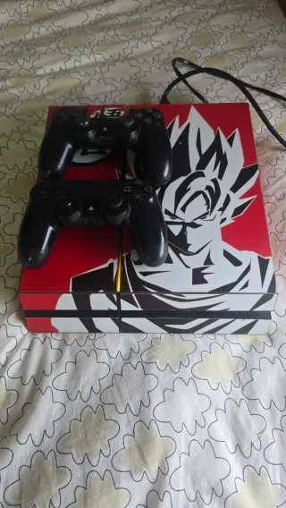 Consola PlayStation 4 con un diseño personalizado de Goku de Dragon Ball. Muchos juegos. -1 Tb de almacenamiento -2 mandos. - Diseño frontal rojo con Goku. - Incluye dos mandos negros. - Versión 9.0. Buen estado funciona perfectamente