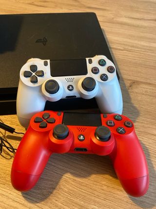 Consola PlayStation 4 Slim con disco duro de 1TB.(90€) - Incluye todos sus accesorios: cable alimentación, cable HDMI, cable para cargar mandos. - Incluye 9 videojuegos.(Colección Uncharted completa: 20€, Dragón Ball Xenoverse 1 y 2: 10€, Tom Clacy's Ghost Recon Wildlands: 5€, GTA: 10€, God of War Ragnarok: 25€, Rocket League: gratis. -El mando negro que es el que venía con la play, tiene un poco de drift a veces. -El mando rojo(20€), se compró adicional, lo que pasa que el cuadrado hay que apretarlo muy fuerte para que funcione, no se por qué.