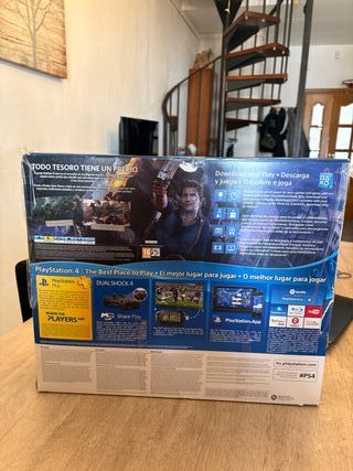 Consola PlayStation 4 Slim en color negro con disco duro de 1TB. Incluye el videojuego Uncharted: I, II y III Cable HDMI