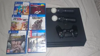 Se vende consola PlayStation 4 Pro de 1TB en color negro. Incluye dos mandos de movimiento y un mando DualShock 4. - Juegos incluidos: - Just Dance - Gran Turismo (PlayStation Hits) - MXGP2 - Call of Duty: Advanced Warfare - Call of Duty: WWII - Tom Clancy's The Division 2