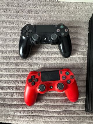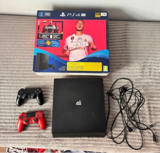 Consola PlayStation 4 Pro de 1TB en color negro. - Incluye dos mandos DualShock 4 (uno negro y uno rojo). - Incluye cables de conexión y alimentación. - Caja original con arte de FIFA 20. - Mantenimiento recién hecho con fotos demostrable