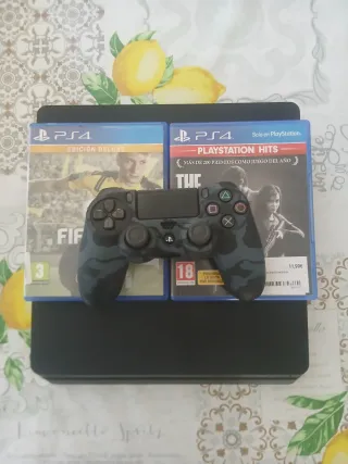 Consola PlayStation 4 Slim con disco duro de 1TB y mando personalizado. - Mando con diseño de camuflaje verde y negro. - Incluye juegos. - Cables de conexión. Preguntar para cualquier duda, se vende también la play sin juegos. Valorado todo en 170€ en el Game