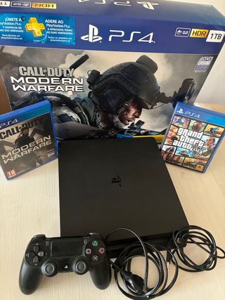 Consola PlayStation 4 slim 1TB en color negro, con dos videojuegos.Usada muy poco. - Incluye Call of Duty: Modern Warfare. - Incluye Grand Theft Auto V. - Incluye mando DualShock 4. - Incluye cables de conexión.