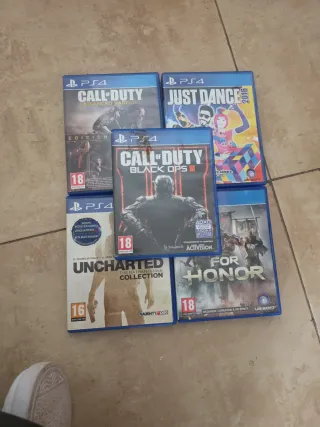 Lote de 5 videojuegos para PlayStation 4. Como es evidente la caja del Call of Duty: Black os 3 tiene una mancha, por lo demás todas las carcasas y discos están en perfecto estado. - For Honor - Uncharted: The Nathan Drake Collection - Just Dance® 2016 - Call of Duty: Black Ops III - Call of Duty: Advanced Warfare