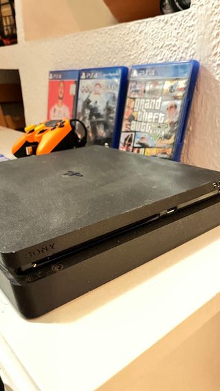 Consola PlayStation 4 en color negro, con mando y varios videojuegos. - Mando de color naranja. - Juegos incluidos: Uncharted 4, Just Dance 2016, FIFA 20, God of War, Grand Theft Auto V. Nos hemos comprado la play 5, a veces funciona introducir los discos de juegos y a veces no, supongo que es arreglable! uso por adultos, es de 500gb.