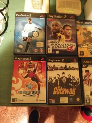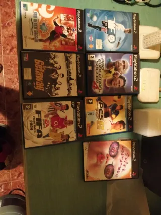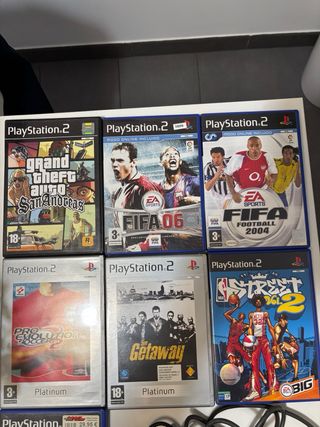Lote de 10 videojuegos para PlayStation 2 junto con dos mandos. - Juegos incluidos: - FIFA 06 - FIFA Football 2004 - Getaway - Street 2 - Pro Evolution Soccer 4 - Grand Theft Auto: San Andreas - Pro Evolution Soccer 3 - Dos mandos Dualshock originales.