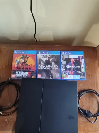 Consola PS4 en buenas condiciones, color negro. Funciona perfectamente. Incluye: Mando (No es original) Cable de alimentación Cable HDMI 3 videojuegos originales: Red Dead Redemption II (2 discos) Call of Duty: Modern Warfare FIFA 21