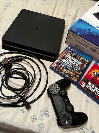 PlayStation 4 en buen estado, incluye un mando original y el videojuego Red Dead Redemption 2. - Mando en perfecto estado. - Consola en excelentes condiciones. - Incluye cable de alimentación.