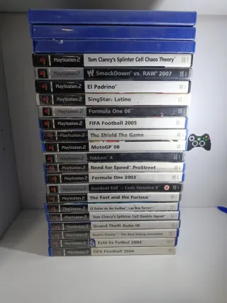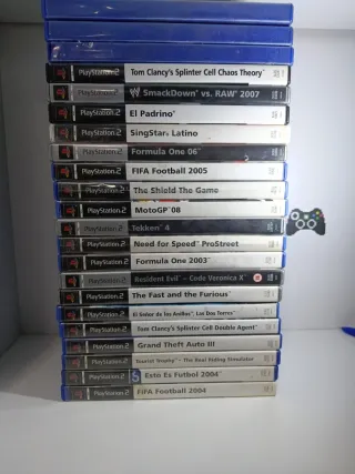 Lote de 20 videojuegos para PlayStation 2. - Tom Clancy's Splinter Cell Chaos Theory - SmackDown vs. RAW 2007 - El Padrino - SingStar Latino - Formula One 06 - FIFA Football 2005 - The Shield The Game - MotoGP 08 - Tekken 4 - Need for Speed ProStreet - Formula One 2003 - Resident Evil - Code Veronica X - The Fast and the Furious - El Señor de los Anillos, Las Dos Torres - Tom Clancy's Splinter Cell Double Agent - Grand Theft Auto III - Tourist Trophy The Real Riding Simulator - Esto Es Futbol 2004 - FIFA Football 2004