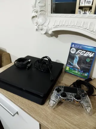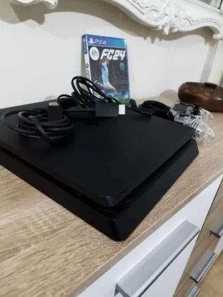 Consola PlayStation 4 Slim en color negro,en perfecto estdo ideal para disfrutar de tus videojuegos favoritos y con poco uso. - Incluye dos mandos (uno negro y uno naranja marca nacon). - Incluye los juegos EA Sports FC 24 y Bloodborne (PlayStation Hits). - Incluye cables de conexión y alimentación. La vendo por falta de uso. *Precio no negociable* Abstenerse ofertas absurdas