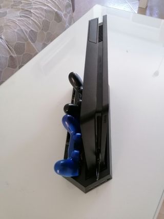 Play Station. Ps4 slim 1TB + 2 mandos + funda de la liga para mando + juego Jurassic World lego + base para poner en vertical con carga de mandos en base + caja original. Todo en perfecto estado. No hago envíos.