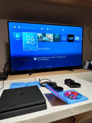 Consola PlayStation 4 Slim en color negro. - Modelo PS4 Slim. - Diseño compacto y elegante. - 500gb . - tiene todo el cableado y el mando ademas de incluir 6 juegos con disco , tengo jna cuenta de fortnite de la temporada 7 capitulo 1 con mas de 120 skins ademas de incluir el gta y full guys si quieres la cuenta son 50 a mayores de lo q negociemos x la play.