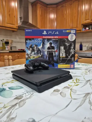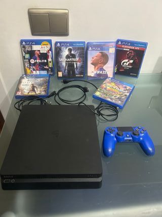 PlayStation 4 Slim en perfecto estado. Incluye una consola y un mando. - Consola en muy buen estado. - Mando perfecto pero con algún signo de uso. Con caja y precio negociable