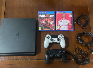 PS4 Slim con extras, en perfecto estado! * 2 mandos Dualshock 4 originales: blanco y negro * 2 juegos originales: FIFA 20 y 2K20 * 1TB de almacenamiento * Playstation Slim * Cable de alimentación + Cable HDMI + Cable USB mini de carga para los mandos * No tiene caja Pregunta para más info. La consola está reseteada de fábrica y lista para usar! ^^ No se aceptan regateos absurdos. Personas serias. Trato en mano!