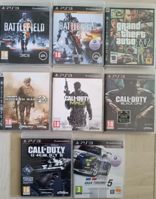 Colección de juegos para PlayStation 3. Todos con instrucciones. - Minecraft: PlayStation®3 Edition - Fallout: New Vegas - Fallout 3 - Assassin's Creed® Revelations - The Elder Scrolls V® Skyrim Legendary Edition - Red Dead Redemption: Game of the Year Edition - Assassin's Creed® La Hermandad - Assassin's Creed™ II - Assassin's Creed® III - Grand Theft Auto IV - Battlefield 4 - Battlefield 3 - Call of Duty: Modern Warfare 2 - Call of Duty: Modern Warfare 3 - Call of Duty: Black Ops - Call of Duty: Ghosts - Gran Turismo 5: Academy Edition