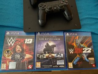 Consola PlayStation 4 Slim de 480GB en color negro. Incluye tres videojuegos. - WWE 2K19 - Destiny 2: Los Renegados - WWE 2K22 -Incluye HDMI y cable de alimentacion de la ps4 -No incluye cargador de mando y los mandos están utilizados