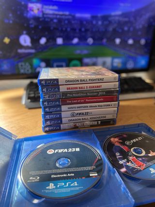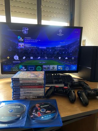 Consola PlayStation 4 500GB en color negro, lista para disfrutar. Urge venta -the last of us no disponible PRECIO LIGERAMENTE NEGOCIABLE - Incluye monitor. - Tres mandos. SOLO FUNCIONA UNO, los otros dos no sé porque me dejaron de funcionar, se enciende la luz cuando lo conectas pero no funcionan, los doy igual - Juegos: FIFA 23, FIFA 21, Dragon Ball FighterZ, Dragon Ball Z: Kakarot, Pro Evolution Soccer 2015, Naruto Shippuden Ultimate Ninja Storm 4, FIFA 22, Dragon Ball Xenoverse, Dragon Ball Xenoverse 2.