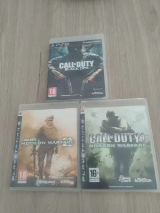 Conjunto de tres videojuegos de la saga Call of Duty para PlayStation 3. - Call of Duty: Black Ops - Call of Duty: Modern Warfare 2 - Call of Duty 4: Modern Warfare En buen estado estético general. Tan sólo destacar una pequeña rotura en la parte superior izquierda de la caja del Call of Duty modern Warfare 4 (ver última foto). Los juegos han sido probados y funcionan perfectamente. Hago envíos y acepto pago y entrega en mano en Castellón.