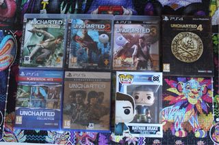 Colección de juegos de la saga Uncharted para PlayStation. - Incluye Uncharted: El Tesoro de Drake (PS3). 10 - Incluye Uncharted 2: El Reino de los Ladrones (PS3). 10 - Incluye Uncharted 3: La Traición de Drake (PS3). 8 - Incluye Uncharted 4: El Desenlace del Ladrón (PS4). Edición especial. 30 - Incluye Uncharted: Colección Legado de los Ladrones (PS5). 18 - Incluye Uncharted: The Nathan Drake Collection (PS4). 10 - Figura Funko Pop! de Nathan Drake. 25