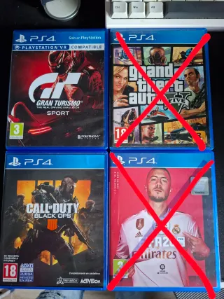 Gran turismo sport (15€) Grand thetf auto V (15€) Fifa 20 (7€) Call of dutty black ops (15€)