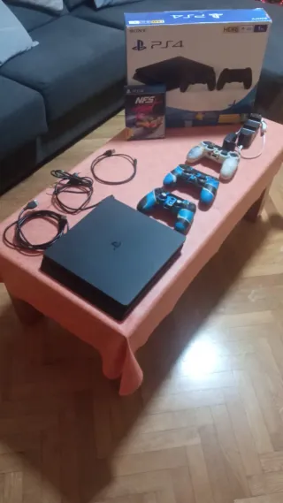 (Se vende lote completo solamente). PlayStation 4 en perfecto estado de funcionamiento con su cable HDMI, cable de alimentación y cable para cargar el mando. Además, 3 mandos con funda, una base de carga para cargar dos mandos a la vez y el vídeojuego Need For Speed Heat. Tanto la videoconsola como los mandos y demás accesorios están cuidados y en el mejor estado posible. Escucho ofertas serias y razonables. Acepto Bizum.