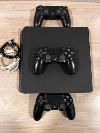 Se vende consola PS4 Slim en color negro, junto con dos mandos y todos los cables necesarios para su funcionamiento. - Incluye consola PS4 Slim. - Dos mandos (uno camuflaje, uno azul). - Cable de alimentación. - Cable HDMI. - Cable de carga para mandos.