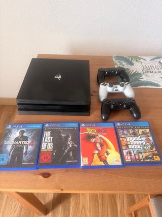 Consola PlayStation 4 Pro de 1TB con accesorios y juegos. - Incluye 4 videojuegos: Uncharted 4, The Last of Us Remastered, Dragon Ball Z Kakarot y Grand Theft Auto V Premium Edition. - Se incluyen 3 mandos (dos negros y uno blanco). - Modelo de consola PlayStation 4 Pro.