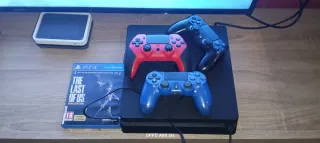 Consola PlayStation 4 en color negro, ideal para disfrutar de tus juegos favoritos. - Incluye la consola. - Tres mandos (uno rojo, uno azul y uno negro). - Juego The Last of Us Remasterizado.