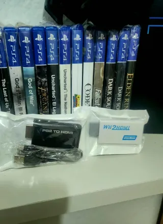 Se vende consola PS4 PRO de 1TB junto con dos mandos y seis videojuegos. - Consola PlayStation 4 Pro. - Dos mandos (uno blanco y uno negro). - Juegos incluidos: LEGO Batman 3, LEGO Star Wars, LittleBigPlanet 3, Star Wars Battlefront II, Star Wars Jedi: Fallen Order Deluxe Edition, EA Sports FC 24.