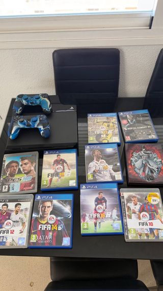 Se vende pack de consola PlayStation 4 en color negro, junto con dos mandos y siete videojuegos. - Consola PlayStation 4. - Dos mandos. - Videojuegos incluidos: - PES 2008 - FIFA 12 - FIFA 14 - FIFA 15 - FIFA 16 - FIFA 17 - Mortal Kombat XL