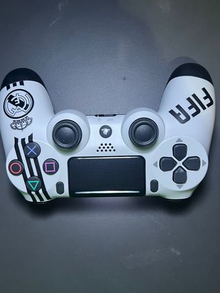 Mando de PS4 personalizado con temática de FIFA y Real Madrid. - Diseño blanco con detalles en negro y rayas. - Logo de FIFA en un lateral. - Escudo del Real Madrid en el otro lateral. Se entrega en su caja y precintado