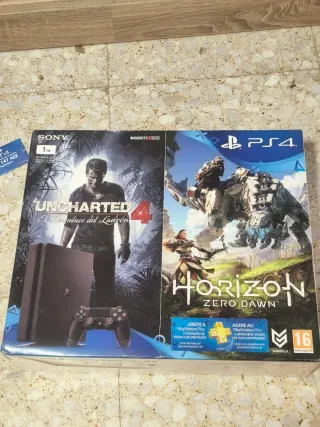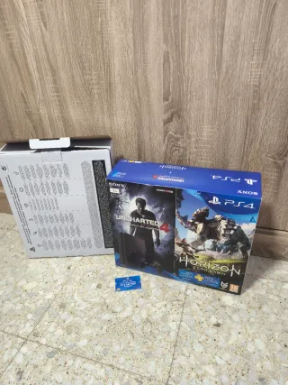 Caja original de PlayStation 4 edición Uncharted 4 & Horizon Zero Dawn. -En buen estado salvo alguna esquina ( en las últimas fotos) - Caja interior. - Tarjeta Azul.