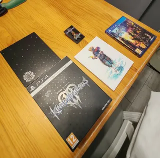Edición Deluxe de Kingdom Hearts 3 para PlayStation 4. - Incluye juego físico. - Caja metálica. - Libro de arte. - Pin coleccionable.