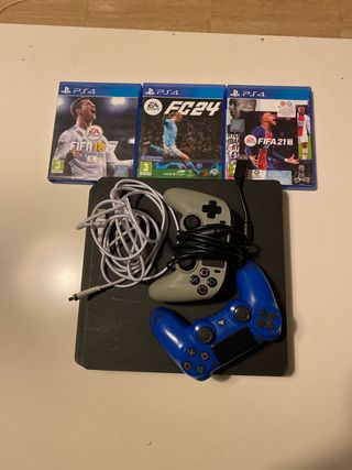 Consola PlayStation 4 en buenas condiciones. - Incluye dos mandos. - Tres juegos: FIFA 18, FC 24 y FIFA 21.