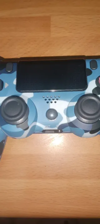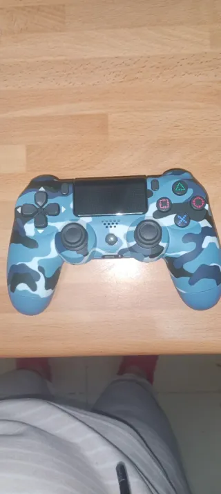 Mando de PlayStation 4 con un diseño de camuflaje en tonos azules. Perfecto para tus sesiones de juego. - Diseño de camuflaje azul. - Botones y joysticks en gris oscuro.