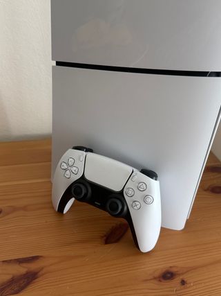 Consola de videojuegos PlayStation 5 Slim Digital en color blanco. - Diseño elegante y moderno. - Edición digital sin lector de discos. -detallito en el control nada más pero no es drift