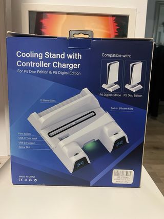 Base de refrigeración y cargador para PlayStation 5. - Compatible con PS5 Edición Disco y Edición Digital. - Incluye adaptador de corriente (5V/3A). - Capacidad para 12 juegos. - Indicadores de carga. - Carga rápida de mandos.