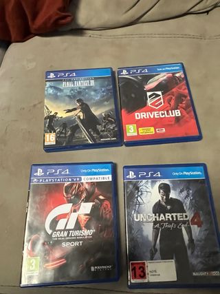 Pack de cuatro videojuegos para PlayStation 4. - Final Fantasy XV (Day One Edition) - Driveclub - Gran Turismo Sport (Compatible con PlayStation VR) - Uncharted 4: El Desenlace del Ladrón se venden por separado tambien a 17€ la unidad