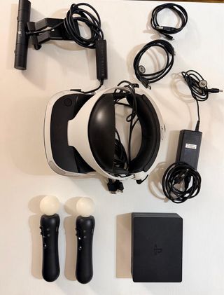 Conjunto de gafas de realidad virtual para consolas PlayStation. - Gafas de realidad virtual. - Dos mandos de movimiento. - Unidad de procesamiento. - Cables de conexión. - Adaptador de corriente.