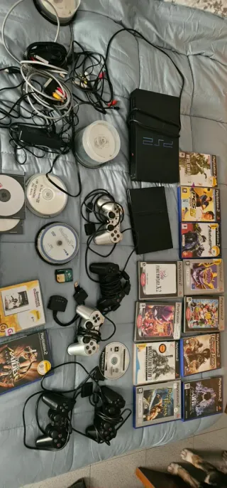 Lote de consola PlayStation 2 con accesorios y videojuegos. - Incluye 2 consolas PlayStation 2. - Se incluyen 5 mandos (2 negros y 3 plateados). - Varios juegos de PlayStation 2. - Cables de conexión y alimentación. -La slim esta pirateada y tiene muchísimos juegos, mas de 100 vírgenes para poder grabar el que quieras. Cualquier duda preguntar sin problema