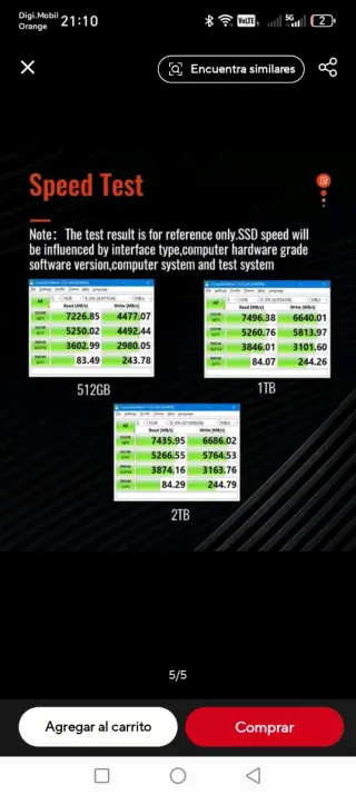 SSD de 2TB con resultados de prueba de velocidad. - Velocidad de lectura: 7435.95 MB/s - Velocidad de escritura: 6686.02 MB/s - Lectura 4K Q1T1: 84.29 MB/s - Escritura 4K Q1T1: 244.79 MB/s está como nueva la puse en la PlayStation 5 y la tengo ahí no uso la Play está guardada y más información mando fotos o videos si están interesados es la misma que está en la foto