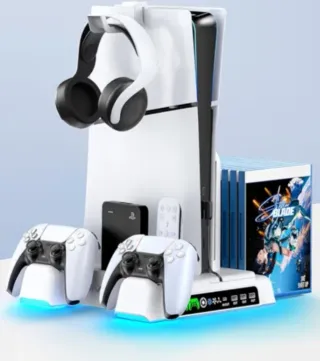 Este accesorio combina un soporte vertical con un ventilador enfriador para tu consola. - Diseño elegante en color negro. - Incluye ventilador para mejorar la refrigeración. - Puertos USB integrados. - Con leds.