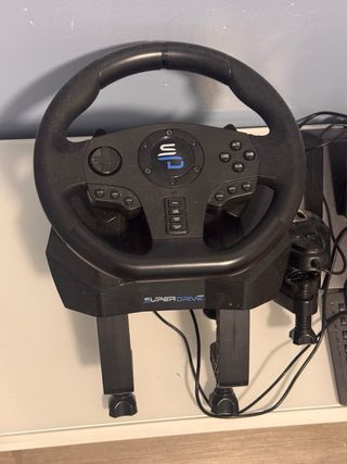 Volante de conducción con pedales. - Diseño ergonómico para mayor comodidad. - Base con pedales de acelerador y freno. - Incluye palancas de cambio. No es compatible con PS5 ni PC (O eso pone en la pagina web, solo lo he usado en PS4) Precio negociable.