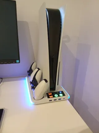 Pack de consola Playstation 5 en color blanco. - Incluye consola. - 2 Mandos. - Base de carga para mandos y refrigeración con luces LED. - Puertos USB adicionales. Play 5 conservada en perfectas condiciones, ha Sido muy bien cuidada además de aportandola ayudas de refrigeración para mayor rendimiento. Incluye también los juegos: Gran turismo 7, fifa 23 y el ratchet and clank, todos ellos nunca usados ya q vino con la consola y ese tipo de juegos no me atrae Se entrega sin la base original de Playstation *SOLO VENTA EN MANO* *PRECIO NEGOCIABLE*