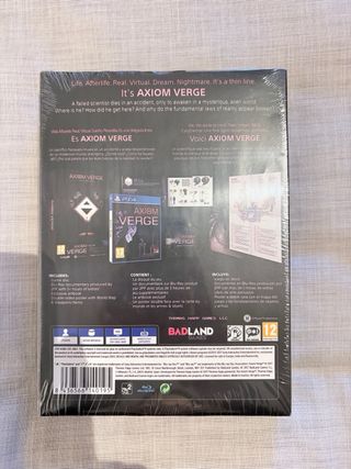 Edición coleccionista del videojuego Axiom Verge para PlayStation 4. - Precintada - Disco de juego. - Documental en Blu-Ray con más de 5 horas de extras. - Libro de arte exclusivo. - Póster de doble cara con mapa del mundo y objetos.